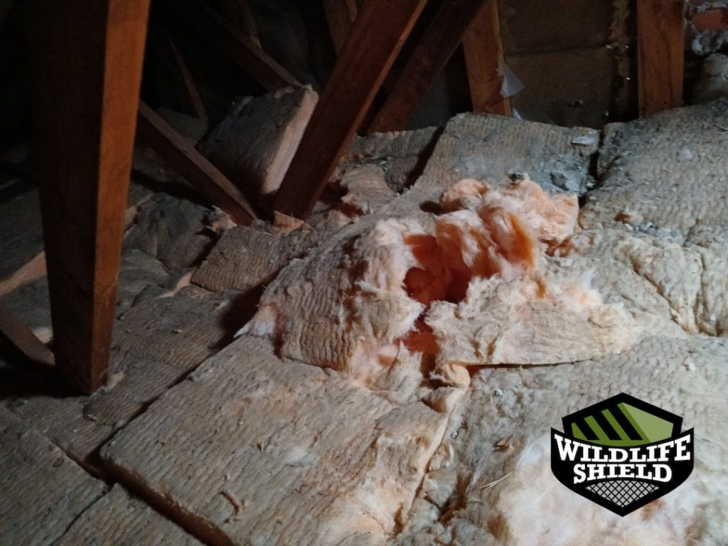 During the initial inspection, we accessed the attic to check for signs of raccoon occupancy and the presence of young. No juveniles were observed. Light penetration was visible through an opening at a roof vent, indicating an active entry point. Disturbed attic insulation was also observed near the vent opening, consistent with raccoon movement.