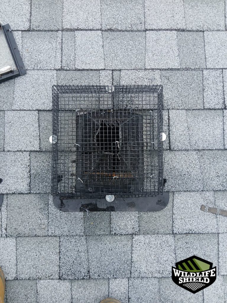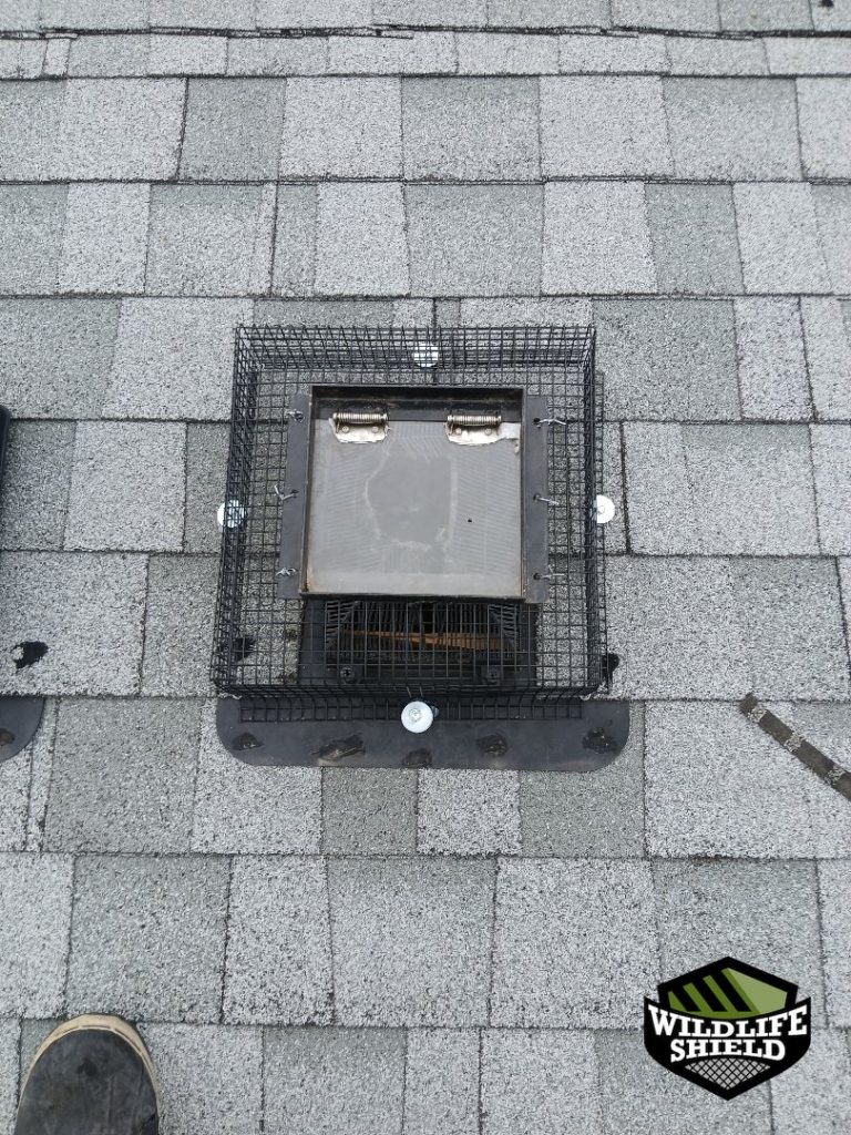 On the follow-up visit, with no further activity reported, the one-way door was removed. The roof vent was then secured with a fitted galvanized steel cage designed to prevent future wildlife entry while preserving airflow.