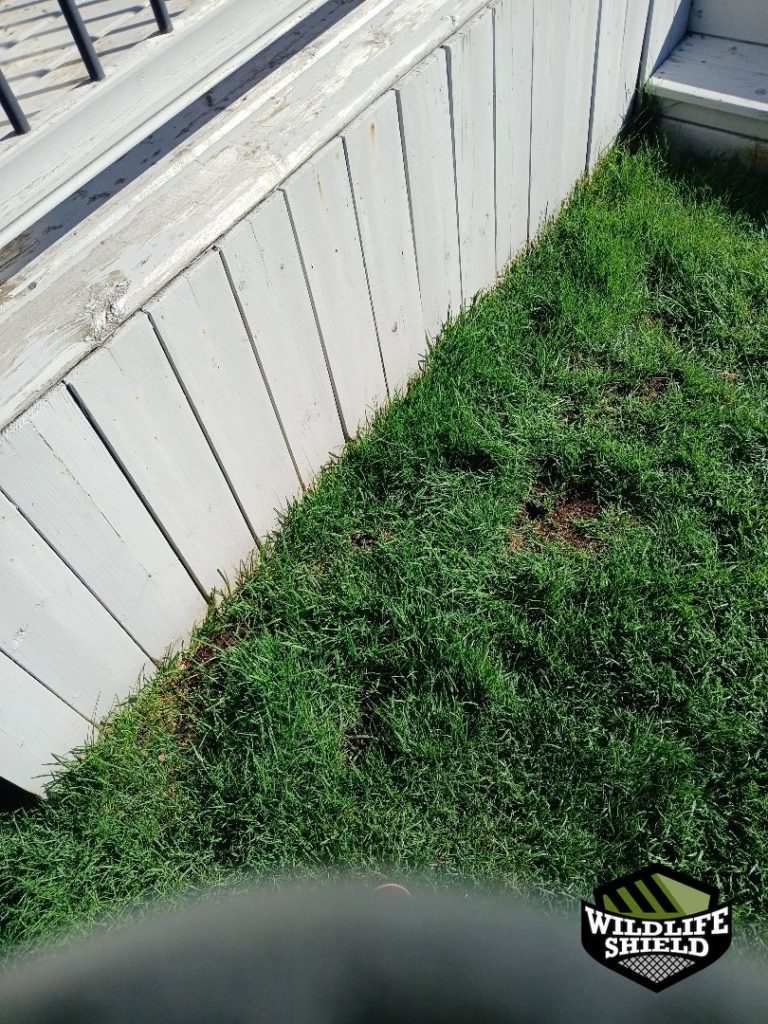 During the initial inspection, disturbed soil and visible excavation were observed along the base of the deck skirting. Voids beneath the deck edge were consistent with skunk denning behaviour. No other wildlife entry points were identified at that time.