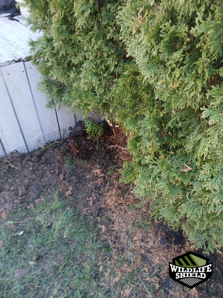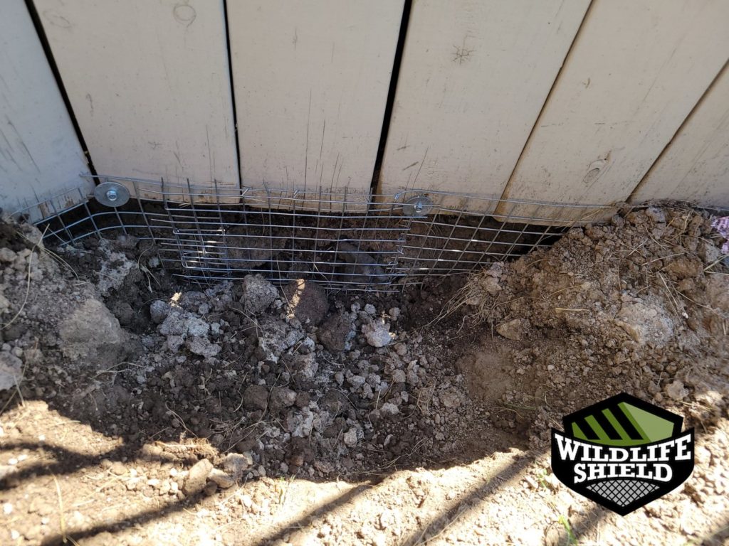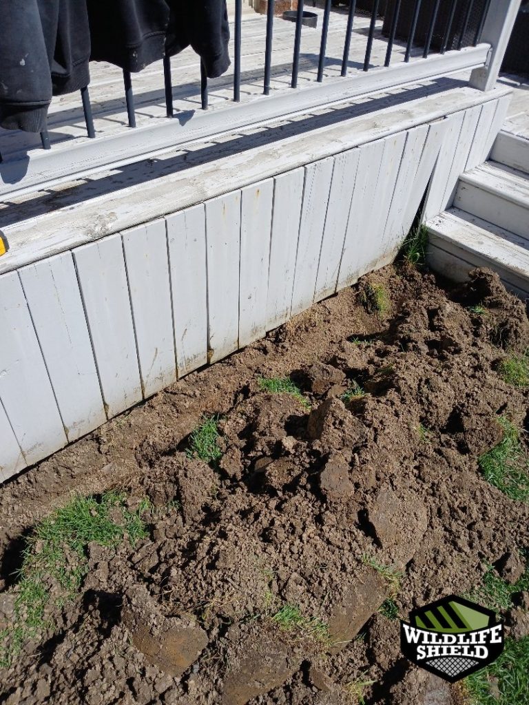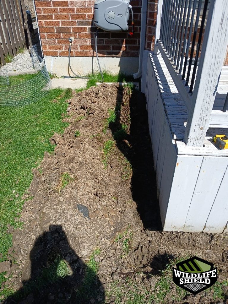 A trench approximately one foot deep and six inches outward was dug along the exposed section of the deck perimeter. Galvanized steel mesh was securely attached to the deck skirting, extended into the trench, and buried to create a permanent underground barrier. Soil was temporarily left open to allow the animal to vacate fully before final sealing.